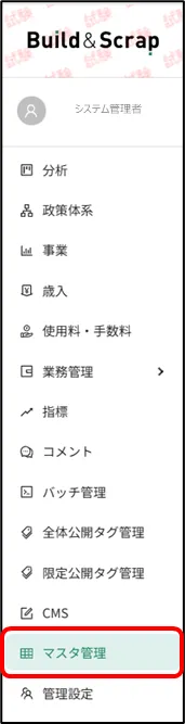 - グローバルメニューより「マスタ管理」をクリックします。<マスタ管理>画面に遷移します。