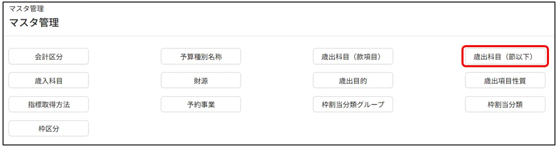 - 「歳出科目(節以下)」をクリックします。<歳出科目(節以下)>画面に遷移します。