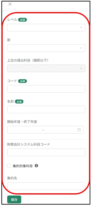 | 財務会計システム科目コード | 4桁まで半角数字で入力 財務会計システムとの連携用の科目コード |